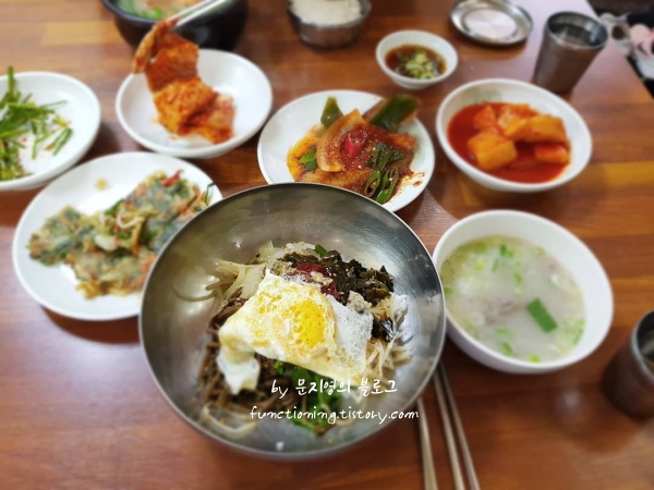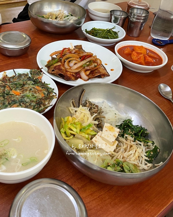 산양식당은 식객 허영만 백반기행 통영으로 하얀 비빔밥과 소머리곰탕이 특히 유명한 이곳은, 비빔밥을 한 숟가락 먹자마자 바다 향과 나물의 고소함이 입 안에서 어우러지는 맛을 느낄 수 있습니다. 비빔밥에 곰탕국물 한 숟가락 넣어 비비면 간이 딱 맞고, 김치와 깍두기, 그리고 다양한 반찬들이 모두 신선하고 맛있었습니다. 가격대는 1인당 1.3만원으로 조금 비쌀 수 있지만, 그만한 값어치를 충분히 한다는 생각이 들었습니다.