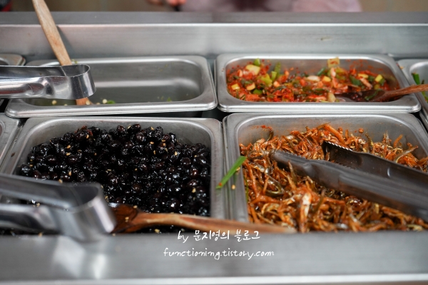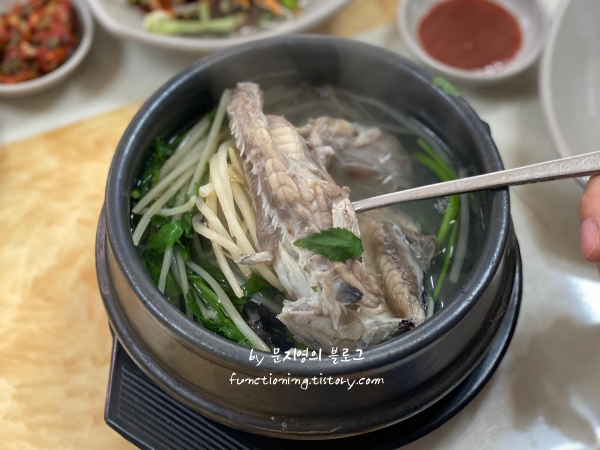 졸복국의 맛을 제대로 즐기기 위해서는 처음에는 맑은 국물로 먹고, 중간에 다대기와 양념장으로 맛을 바꾸며 마지막에는 식초를 몇 방울 떨어뜨려 먹는 것이 베스트였습니다. 한 가지 음식으로 세 가지 맛을 즐길 수 있다는 점이 너무 좋았습니다. 반찬 중에서는 멸치초무침과 김무침이 특히 맛있어서 리필해서 먹었습니다.