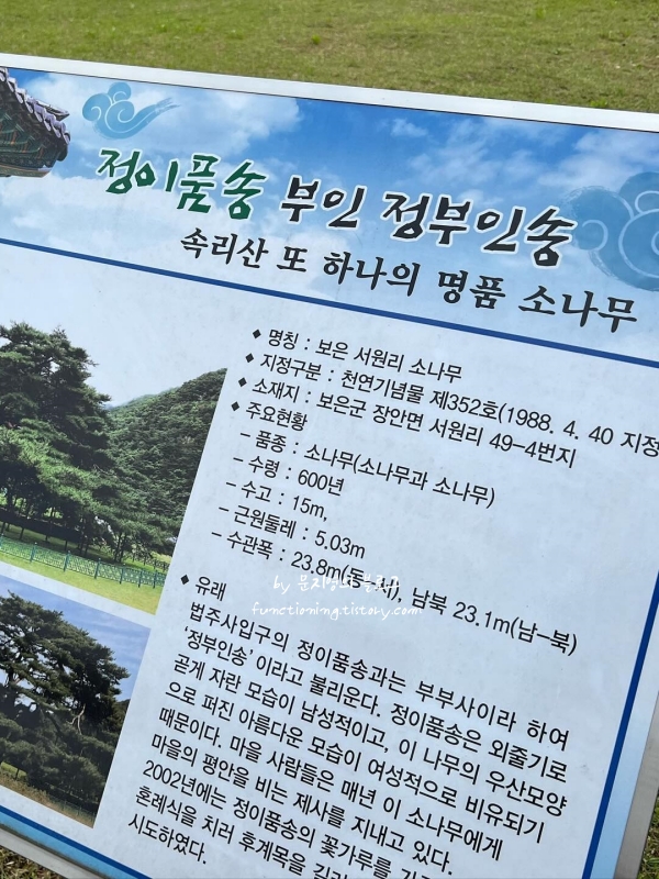 정이품송은 태풍으로 인해 일부 가지가 소실되었지만, 여전히 웅장하고 멋진 모습을 자랑합니다. 올곧게 서 있는 모습이 정말 인상적이었고, 세조가 벼슬을 내릴 만하다는 생각이 들 정도로 기품이 있어 보였습니다.