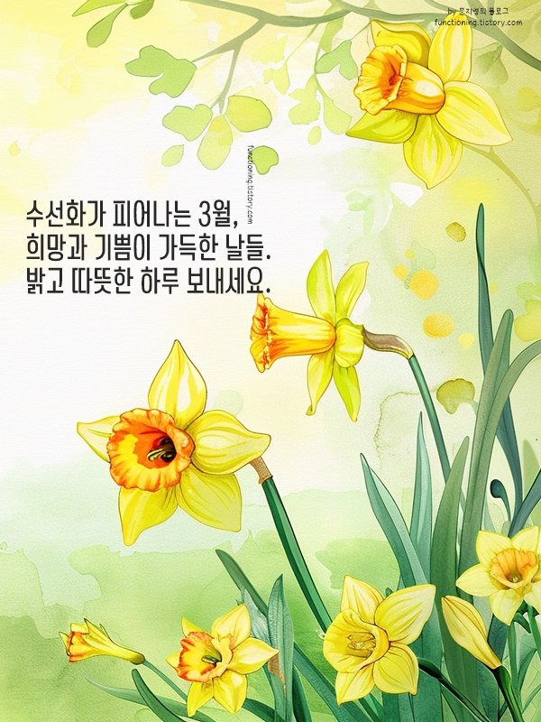 수선화가 봄바람을 맞으며 살랑이는 계절입니다. 바람결에 은은하게 전해지는 꽃향기가 봄의 온기를 더해 주네요. 벚꽃이 피기 전, 가장 먼저 피어난 꽃들이 따뜻한 인사를 건넵니다. OO님께도 환한 미소가 가득한 하루가 되길 바랍니다.