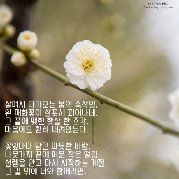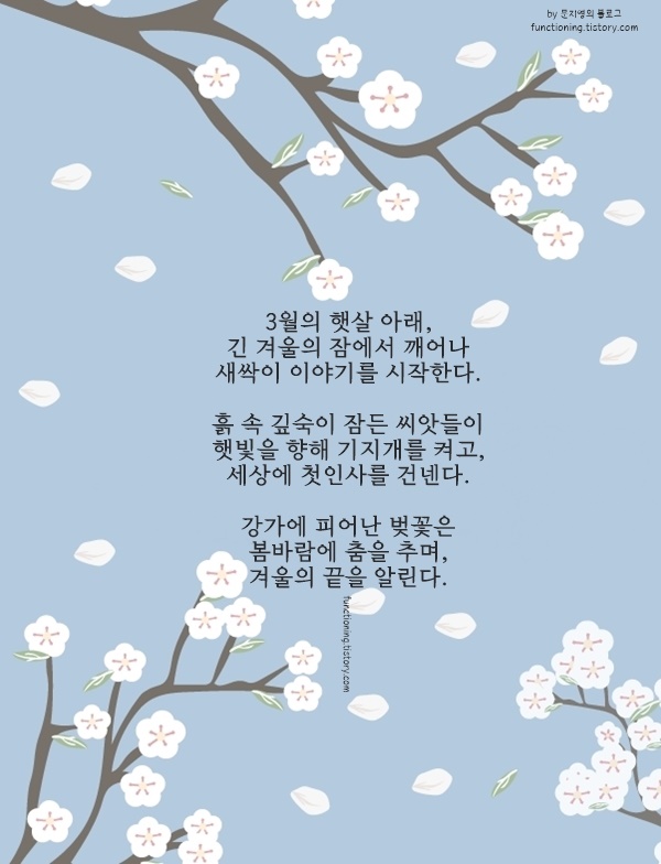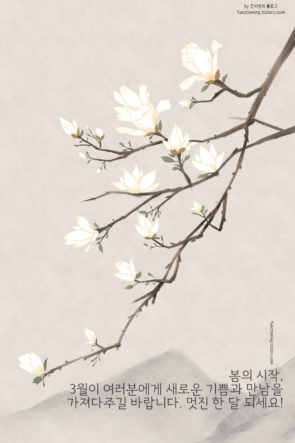 3월은 기다림과 설렘이 공존하는 달이기도 합니다. 아직 봄이 완전히 자리 잡지 않았지만, 곳곳에서 봄이 오고 있다는 신호를 보내지요. 가장 먼저 피어나는 매화를 시작으로, 개나리가 노랗게 꽃망울을 터뜨리고, 목련이 우아한 자태를 드러내며, 벚꽃이 피어날 날을 손꼽아 기다리는 시기입니다. 바람 끝에 남아 있는 겨울의 흔적이 느껴지기도 하지만, 그 속에서도 봄을 향한 따뜻한 기운이 점점 커져 가는 것을 느낍니다. 겨울의 끝자락과 봄의 문턱 사이에서, 한 발짝 앞으로 나아가고 싶은 마음이 차오르는 순간이기도 하지요.