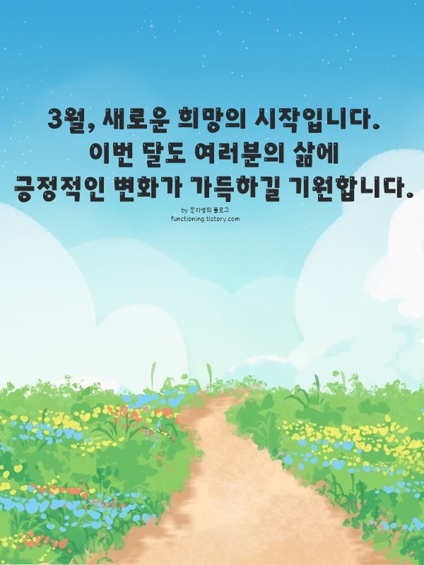 겨울의 흔적이 사라지고, 부드러운 봄바람이 불어오는 3월입니다. 아침 공기에도 따뜻한 기운이 감돌고, 햇살이 창가를 비출 때마다 계절의 변화를 실감하게 됩니다. 하루가 점점 길어지면서 기분 좋은 여유가 찾아오는 것 같네요. OO님께도 따뜻한 순간들이 차곡차곡 쌓이는 나날이 되길 바랍니다.