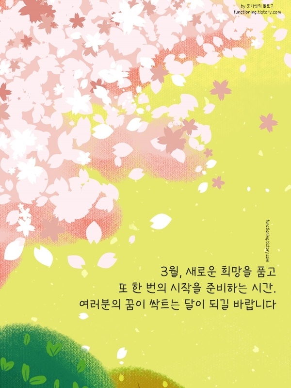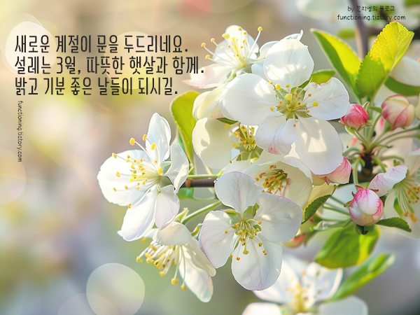 3월이 오면 어느새 공기가 달라집니다. 아침저녁의 찬기운도 점점 약해지고, 낮의 온기가 몸을 감싸기 시작하죠. 겨우내 앙상했던 나뭇가지에도 생기가 돌아옵니다. OO님의 하루도 이 계절처럼 따뜻하고 활기차길 바랍니다.