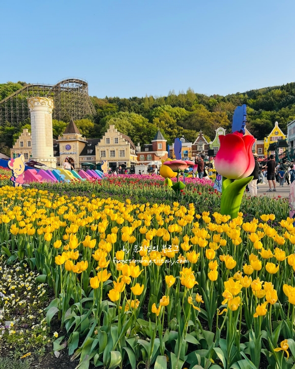 튤립 사이로 걷다가 벤치에 앉아 쉬고, 군데군데 놓인 테마 정원을 지나면 어느 순간 해가 기울어 있다. 놀이기구를 타지 않아도 하루가 자연스럽게 흘러간다. 노란 튤립 사이로 핑크와 보라빛 튤립이 촘촘하게 섞여 있어 걷는 내내 기분이 산뜻했다. 튤립의 색감이 가장 풍부한 4월 중순쯤, 날씨가 맑은 날 오후 시간대를 추천한다.