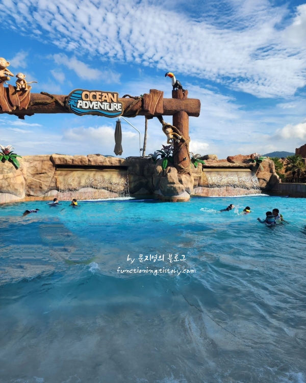 워터파크 자체는 열대 화산섬을 테마로 꾸며져 있어요. 대형 파도풀, 실내외 슬라이드, 유아 전용 구역, 이벤트탕까지 테마는 알차고 동선도 복잡하지 않아서 초등학생 아이들 놀기엔 딱이더라고요. 실내 쪽엔 수치료 기능이 있는 탕도 마련돼 있어서 보호자도 그냥 대기만 하는 게 아니라 함께 여유를 즐길 수 있었고요.