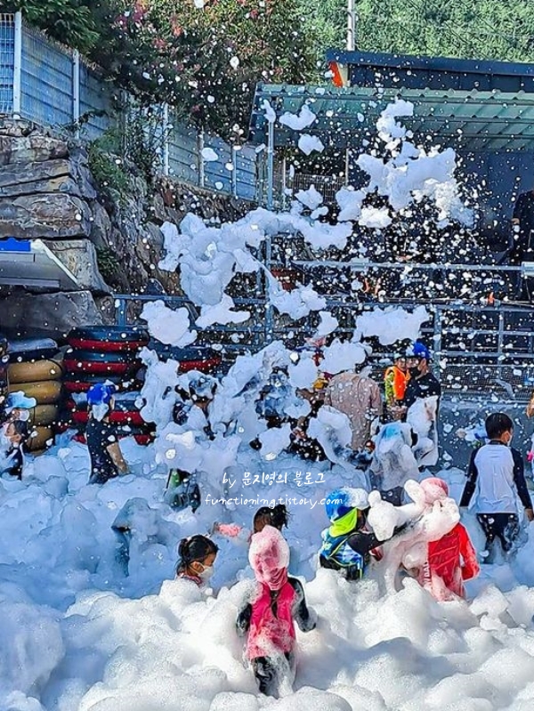 여름에 이곳을 강력 추천하고 싶은 이유는, ‘튭제 물놀이 풀파티’가 숲속 리조트처럼 펼쳐지기 때문이에요. 버블파티에 물썰매, 메기잡기까지—계곡 소리가 배경음악, 아이들 웃음소리가 축제의 리듬이었으니까요. 물썰매와 버블파티가 이어지는 세션은 ‘아이 천국’ 수준이고, 트램폴린과 모래놀이터 덕에 물놀이 후에도 체력 충전이 가능해요. 이곳에선 그저 쉬는 피서가 아니라, 자연 속에서 함께 뛰고 웃고, 몸도 마음도 풀리는 ‘여름판 파티’였다—라고 표현할 수 있을 것 같네요.