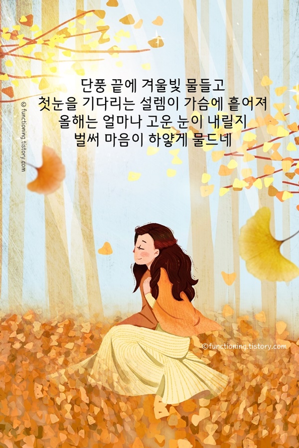 계절은 이미 겨울 문턱에 다다랐는데, 마음은 아직 가을에 머물러 있네요. 따뜻했던 계절을 천천히 떠나보내며, 새로운 계절을 맞을 준비를 해요. 이 변화의 시간에도 당신은 따뜻하게 빛나길 바랍니다.