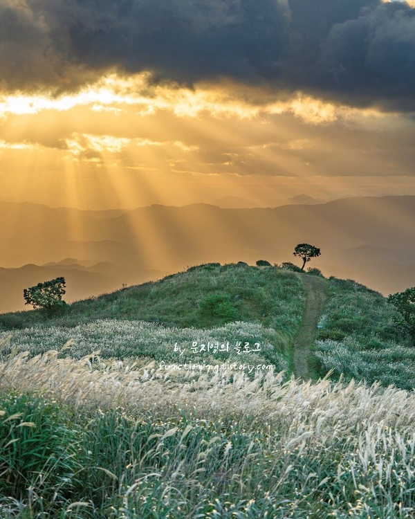 산청과 합천의 경계에 있는 이곳은 사계절 내내 다른 옷을 갈아입는 산청의 보물이에요. 봄에는 분홍빛 철쭉이 산 전체를 덮고 가을에는 은빛 억새가 파도치는 모습이 그야말로 장관이라 눈을 뗄 수 없게 만들죠. 정상 근처까지 차로 올라갈 수 있어 힘든 등산을 하지 않아도 압도적인 능선 풍경을 마주할 수 있다는 게 큰 매력이에요.