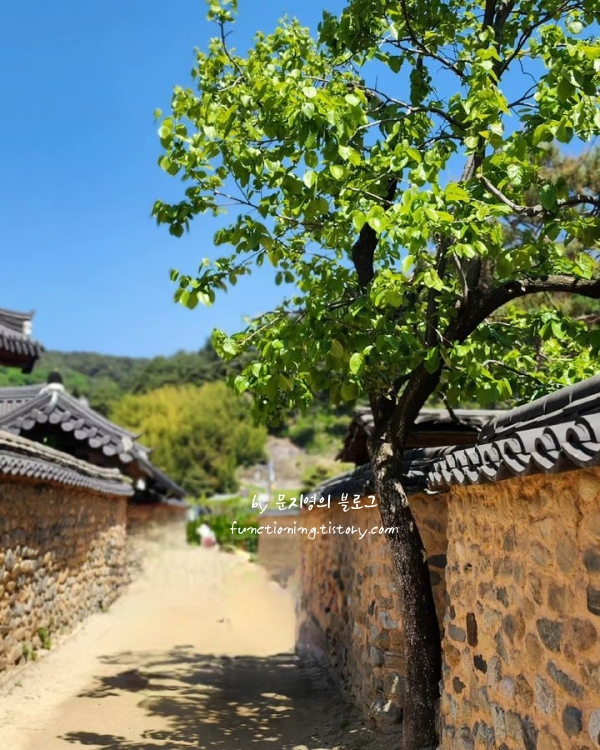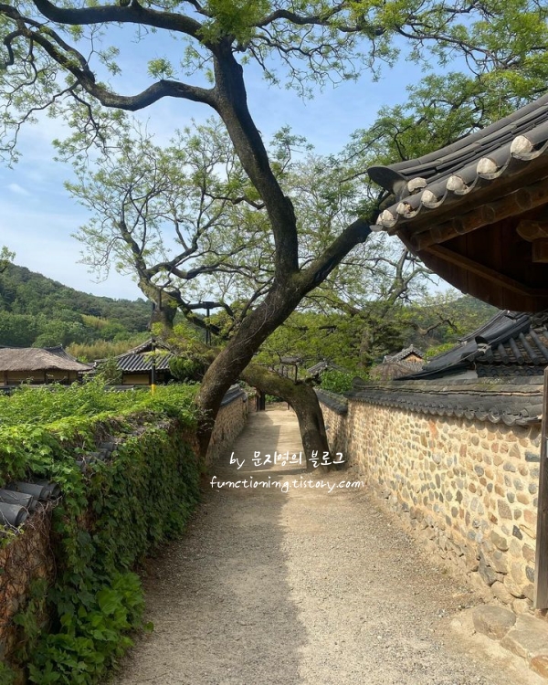 '한국에서 가장 아름다운 마을'이라는 수식어가 아깝지 않을 만큼 고풍스러운 한옥과 돌담길이 잘 보존되어 있어요. 마을 중심에 있는 부부 회화나무가 서로 교차하며 터널을 만든 모습은 이곳의 상징과도 같은데, 그 아래서 사진을 찍으면 정말 예쁘게 나오더라고요. 골목골목 핀 매화나 산수유가 기와지붕과 어우러진 풍경을 보고 있으면 시간이 멈춘 듯한 착각에 빠집니다.