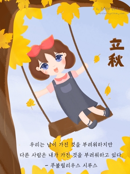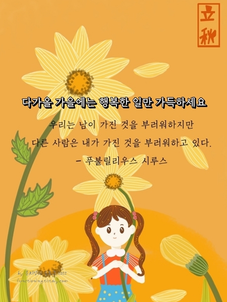 4. 누군가 힘겨워할 때 모른 척 넘어간다면 당신도 언제인가 힘겨워할 때 아무도 함께하려 하지 않을 것입니다. 서로 돕고 보살펴야 쉬워집니다. 혼자만 잘 살려다가 결국은 고난이 왔을 때 누구의 도움도 없이 혼자 짊어지게 되겠지요. 몸도 마음도 더위에 지쳐가는 요즘, 멀리서 힘을 보태드립니다. 선선한 가을 바람을 기다리며 입추를 맞이하는 오늘도 화이팅하세요.