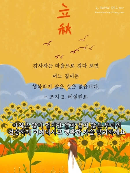 8. 누군가를 생각하는 힘, 배려하는 힘으로 세상은 어김없이 잘 돌아갑니다. 불평보다는 그래도 건강함에 감사하는 마음으 입추를 맞이합니다. 시원한 바람 맞으며 한들한들 코스모스 구경하는 가을을 기다리며 오늘도 건강한 하루 되셨으면 좋겠습니다.
