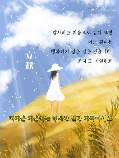 7. 폭염에 짜증이 늘어가는 요즘입니다만 마음만은 환하고 시원하셨으면 좋겠습니다. 타들어 가는 속을 달래줄 시원한 물 한잔처럼 서로에게 상쾌하게 다가가는 입추 되시길 바랍니다.