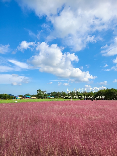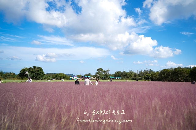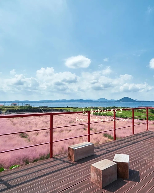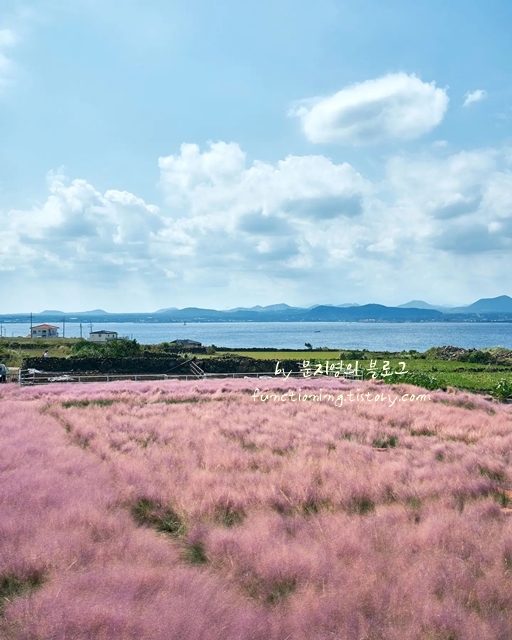 제주에서만 볼 수 있는 바다뷰 핑크뮬리! 생각보다 더 예뻤고 핑크빛 핑크뮬리밭 앞으로 푸르른 바다 그리고 뒷쪽으론 초록초록한 나무와 돌담까지 있어서 외국적이면서도 제주 감성 한가득한 10월 제주도 가볼만한곳 10곳 장소였습니다. 바다와 본섬이 보이는 곳에 핀 핑크뮬리와 이국적인 풍경을 느낄 수 있는 야자수길이 은근히 매력적이었습니다.