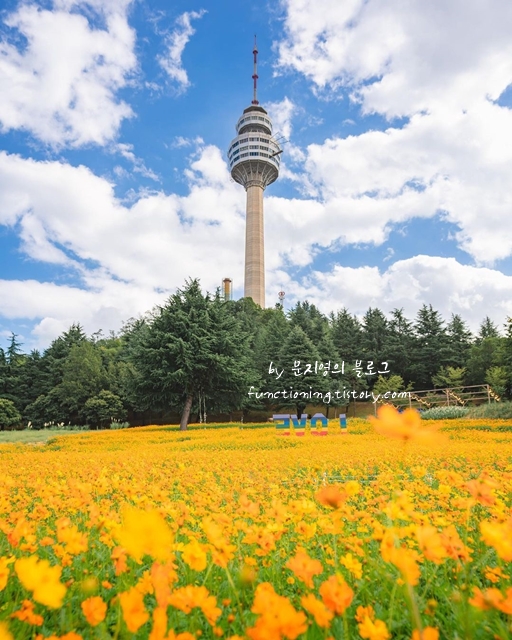 지금 이월드를 가야하는 이유는 이미 시작된 이월드 가을축제 때문입니다. 인생꽃사진관이라 하여 가을꽃들로 가득한 이월드는 지금 5천평의 드넓은 가든에 황화코스모스가 가득 피어나고 있어서 83타워를 배경으로 인생샷을 찍을 수 있었습니다. 핑크뮬리도 예뻤습니다.
