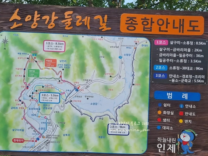 소양강 비경 머금은 둘레길로 최근 인제 가볼만한곳 베스트 10 핫한 곳입니다. 소양강하면 흔히들 춘천을 떠올리기 쉽지만, 강줄기의 시작은 청정고을로 이름난 인제입니다. 인제군에서 발원한 소양강은 춘천까지 흘러가게 되며 소양강 둘레길은 인제군에 걸친 상류를 따라 3개 구간으로 총연장 23㎞의 트래킹 코스입니다.