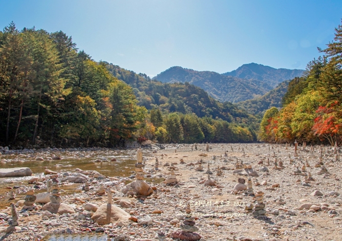 설악산 백담사 일대는 백수정을 깔아 놓은 것 같은 맑고 시린 백담사 계곡을 볼 수 있습니다. 이곳에 돌탑을 쌓으면 소원이 이루어질까요?