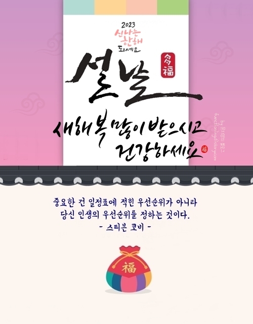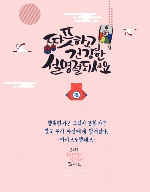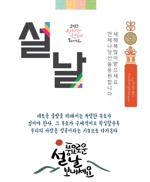 새로운 한 해가 시작되는 설날입니다. 새해의 힘찬 기운으로 건강하고 튼튼한 2023년 되길 바랍니다. 가정에는 늘 건강과 행복이 가득하길 바라며 올해 무슨 일을 하든 술술 풀리는 한 해가 되길 진심으로 응원합니다.