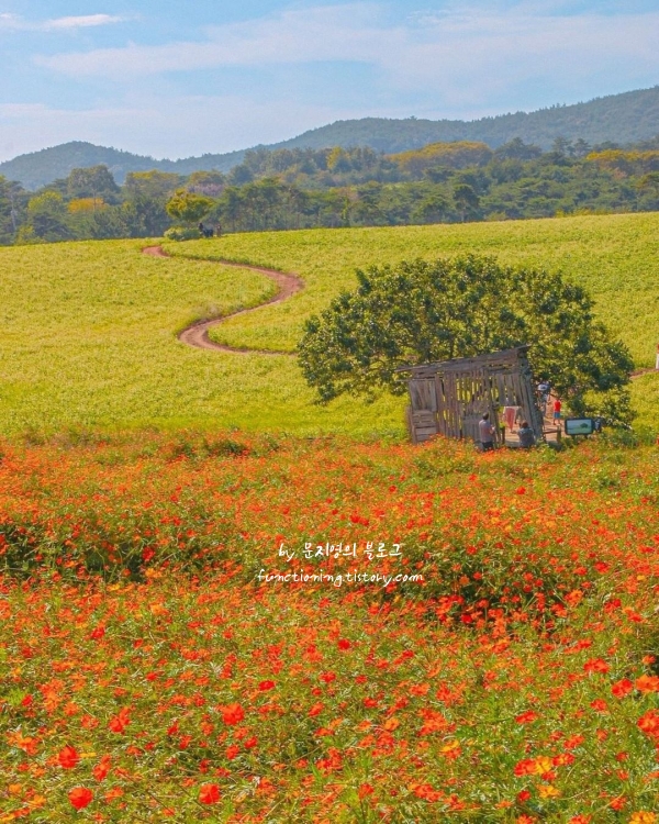봄에는 청보리로 유명하고 가을엔 메밀꽃으로 유명한 이 곳 학원농장은 여름 해바라기도 너무 예쁩니다. 매 계절을 대표하는 꽃들이 빼곡하게 심어져 있어서 아주 꽉찬 느낌을 받았습니다. 주변 풍경과 수천송이의 계절꽃들이 내 마음을 사로잡았고, 또한 드라마 도깨비 촬영지였던 학원농장에서는 한 그루의 도깨비 나무도 볼 수 있습니다.