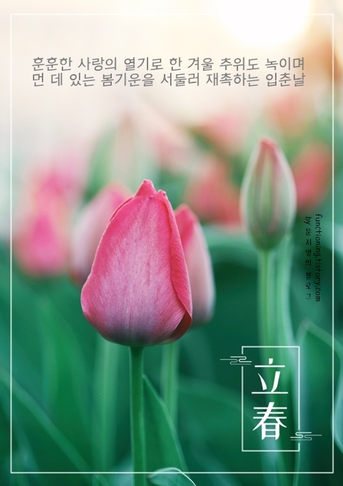 입춘의 날, 우리의 마음도 새로운 꽃 한 송이처럼 피어납니다. 봄은 언제나 무한한 가능성을 품고 있으니 우리의 꿈도 그렇게 무한한 가능성을 가지고 힘을 내 봅시다.
