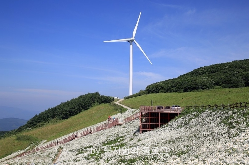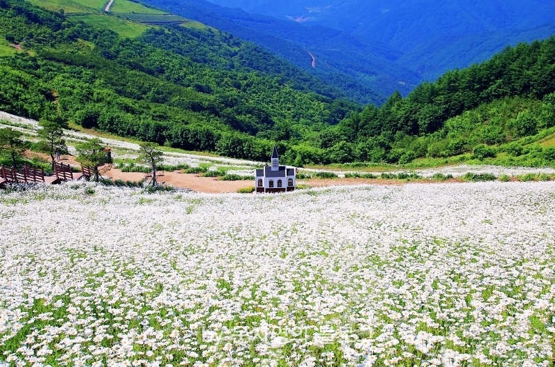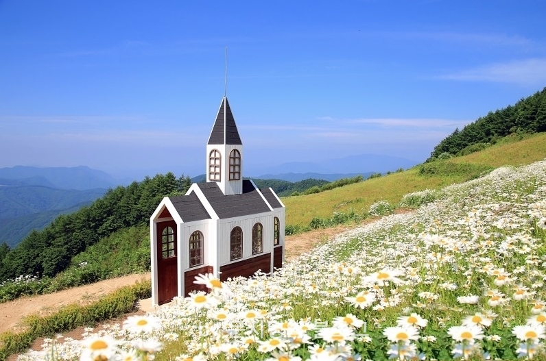 굉장히 광활한 이곳은 처음에 고랭지 채소를 재배하던 곳이었지만 지금은 야생화 생태 단지로 바뀌었습니다. 몇 해전부터 평창 가볼만한곳 베스트 10으로 여름이면 핫플레이스가 되었고 6월 7월 국내여행지 베스트 10으로 최고 인기 많은 곳입니다. 미니어처 같은 작은 성당과 탁 트인 풍경을 배경으로 선 풍력발전기와 함께 사진을 찍고, 6~7월에는 천상의 화원을 이루는 데이지 꽃을 배경으로 인생사진을 찍을 수 있습니다.