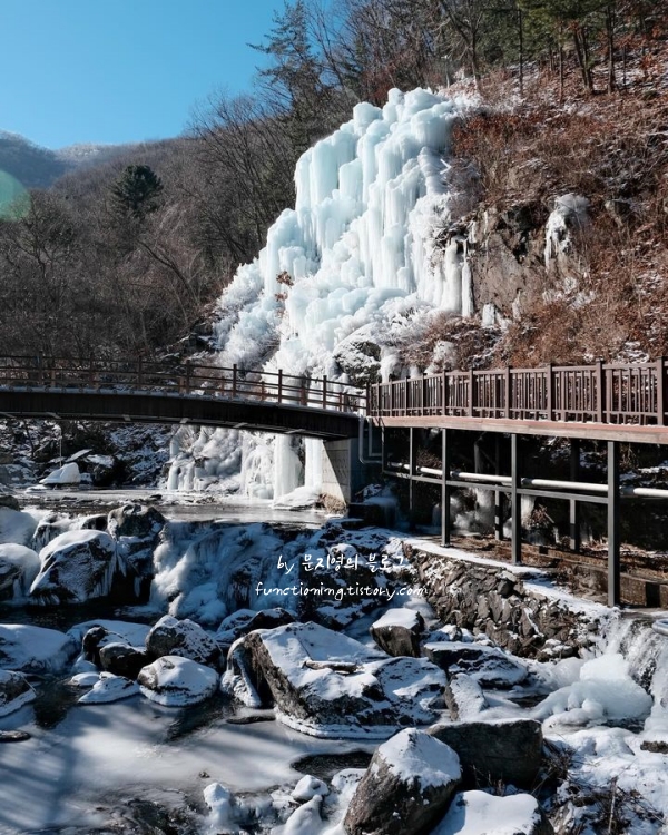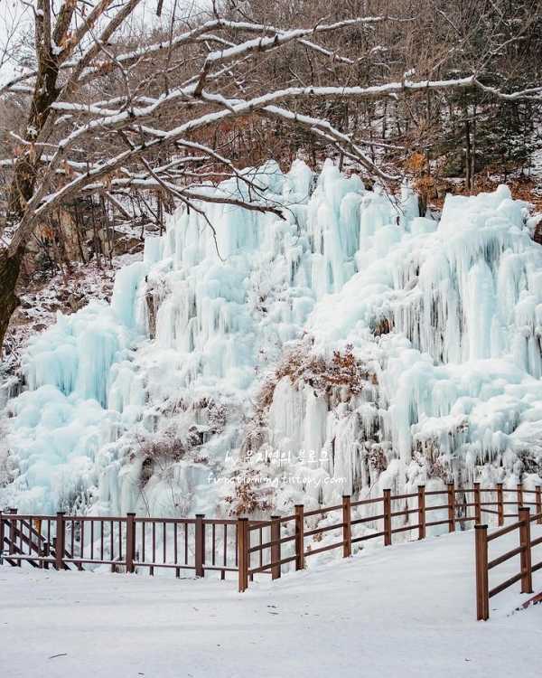 가평 어비계곡은 자연 명소로, 겨울철에는 장관을 이루는 얼음 빙벽으로 유명한 겨울 경기도 가볼만한곳 베스트 10입니다. 빙벽은 인공적으로 물을 뿌려 만들어지며, 은은한 푸른빛을 띠어 신비로운 분위기였습니다.
