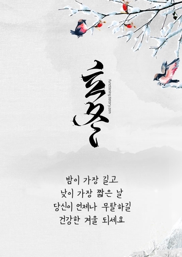동지는 오래된 기억처럼 차분하고 깊은 계절입니다. 팥죽을 나누며 서로의 건강과 안녕을 기원했던 그 마음처럼, 당신의 겨울에도 따스한 온기가 스며들기를 바랍니다. 긴 밤이 지나 더 밝은 낮이 찾아오듯, 당신의 내일도 더 나아질 것입니다. 오늘 하루도 평안한 시간 보내시길 기원합니다.