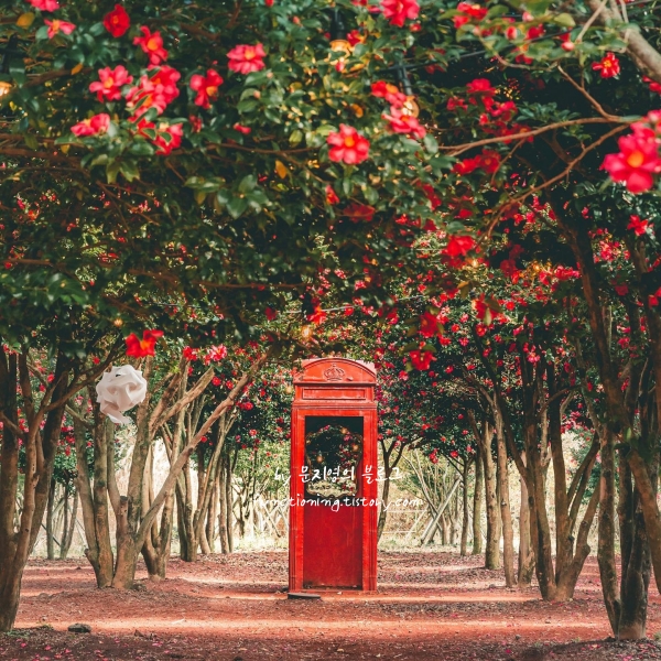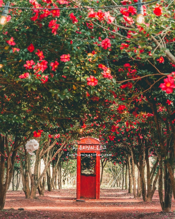 기차를 타고 테마파크를 둘러보는 동안, 두 번째 정거장인 레이크사이드역에서 내리면 빨간 공중전화 박스와 철길이 어우러진 동백꽃숲을 발견할 수 있습니다. 사람들이 잘 모르는 제주의 숨은 동백 명소로, 조용히 동백을 즐기기에 좋아요.