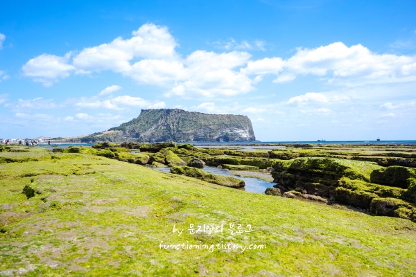 물이 빠지는 시간에 맞춰 방문하면 초록빛으로 뒤덮인 바위들이 드러나, 광치기 해변에서만 볼 수 있는 특별한 풍경을 볼 수 있는데 바위 위를 걸을 때는 미끄러우니 조심해야 합니다.